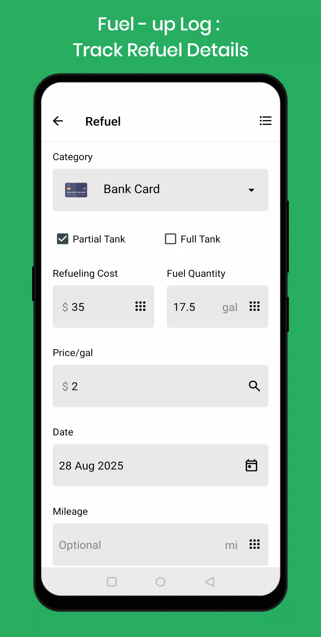 Fuel Efficiency Monitoring: The app provides accurate calculations of MPG, km/l, mi/l, and L/100km after each refill, helping you understand your vehicle's fuel efficiency and costs.