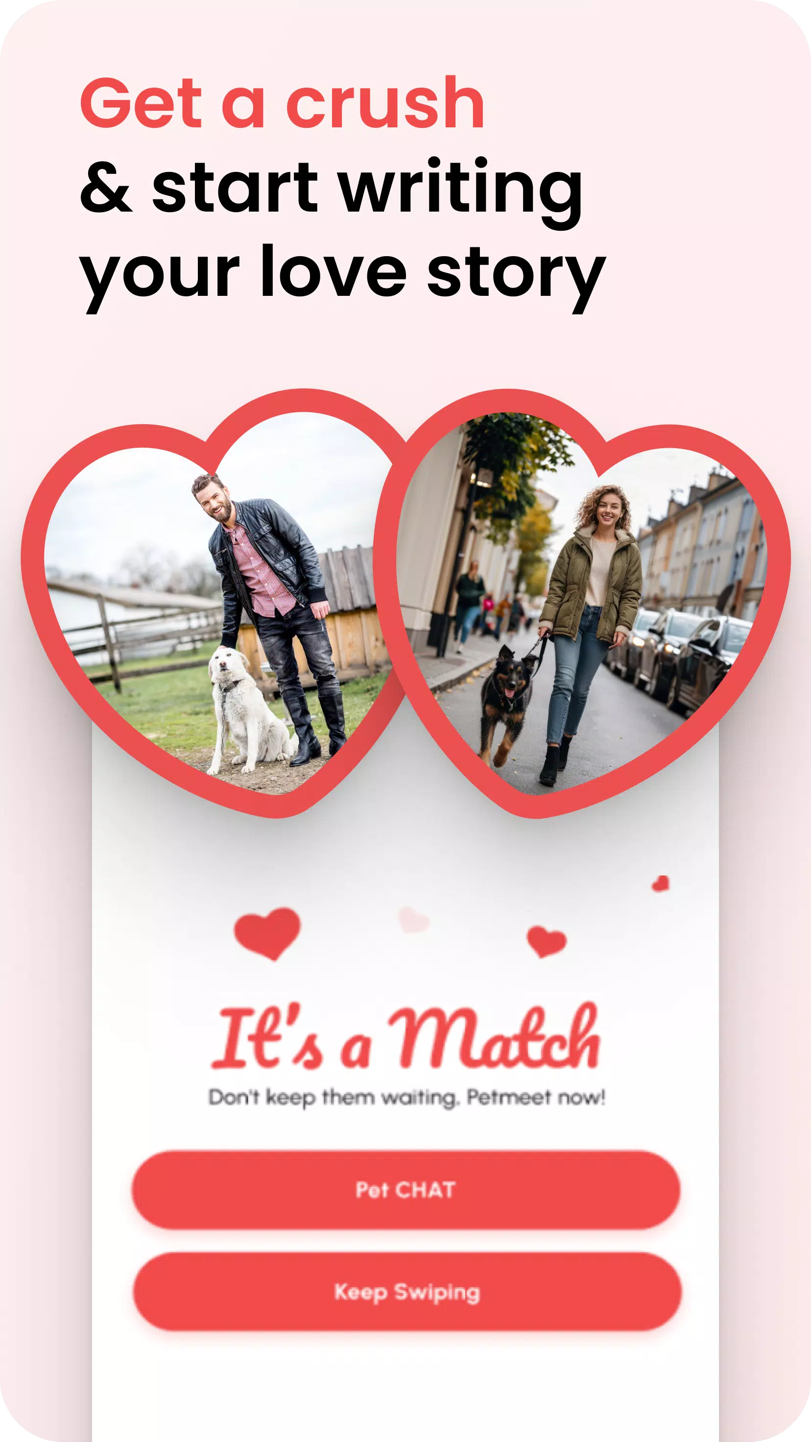 Introducing PetMeet: Dating & Friends App The ultimate dating and friendship app for pet lovers! Join a community of like-minded individuals who share your passion for pets and are looking for meaningful connections. With unique features like 'Meet My Pet' moments and exclusive events for owners and their furry friends, PetMeet goes beyond traditional dating apps. Choose from subscription plans tailored to your needs and enjoy a safe, ad-free experience. Download PetMeet today and embark on a journey of love, happiness, and endless puppy kisses. Your pawfect match is just a swipe away! Visit our website for more information and start your pet-loving adventure now.