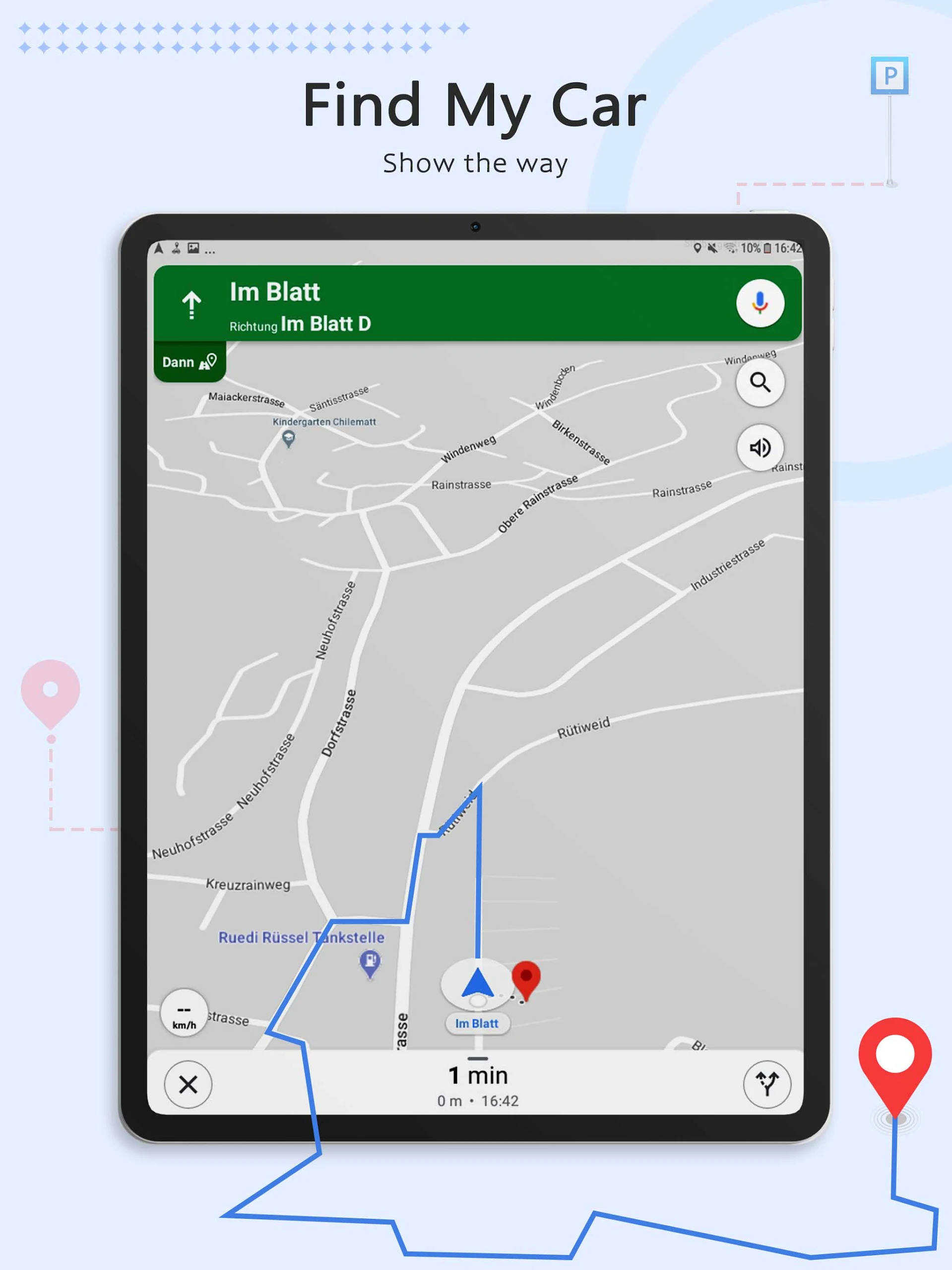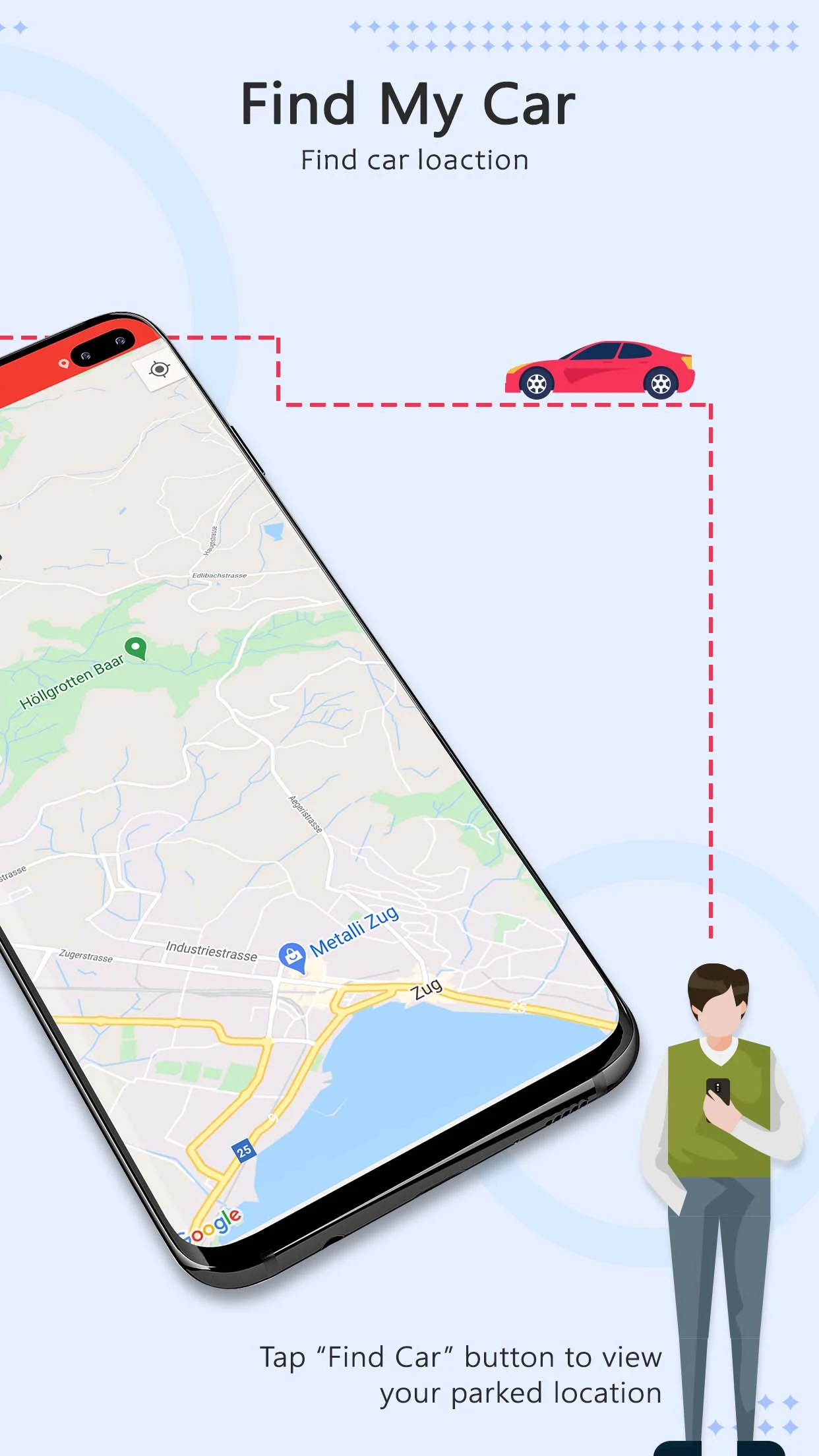 - Simply press the "Park Button" to record your parking location, and later select "Find Car" to retrieve it on the map.
