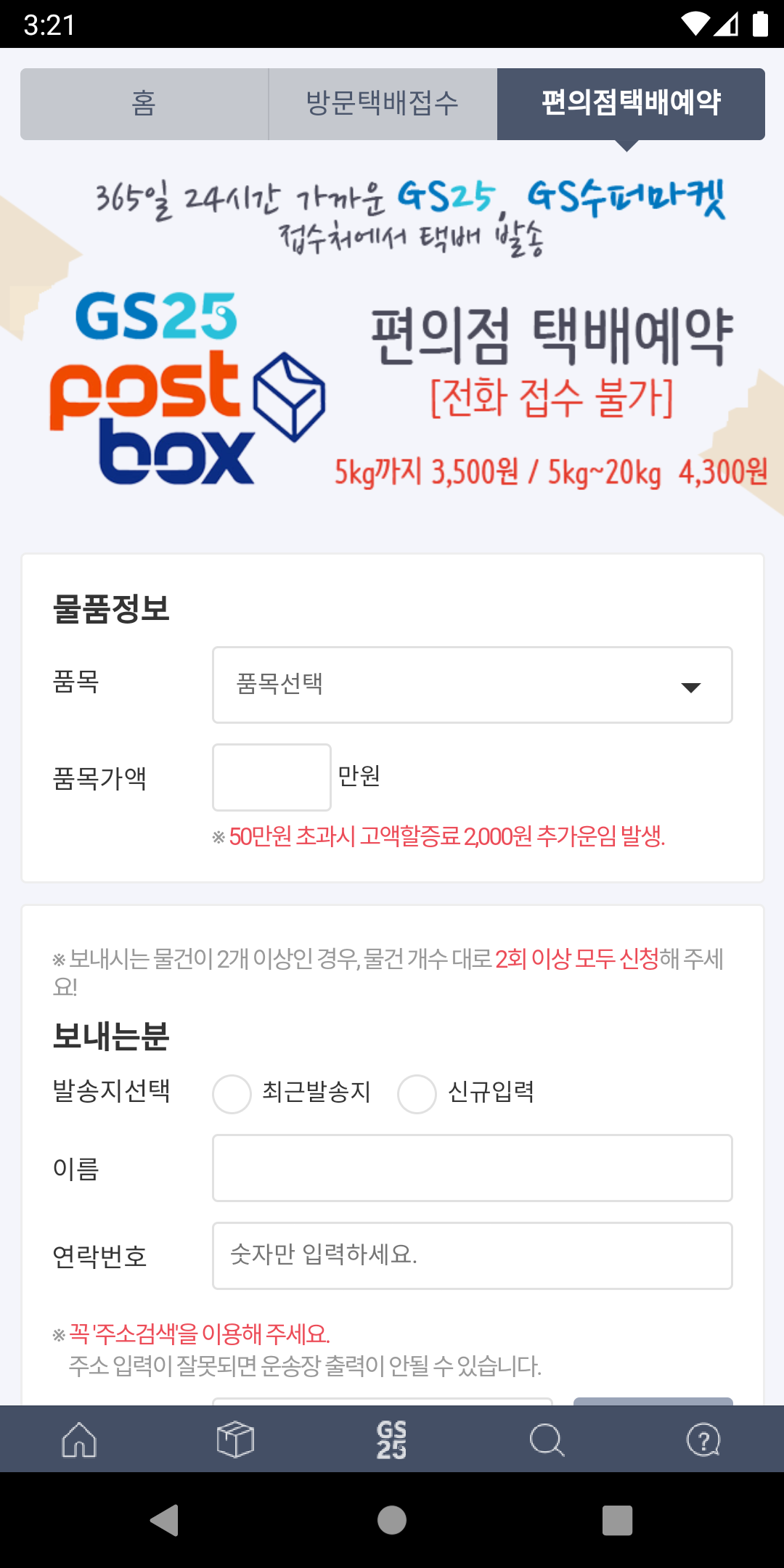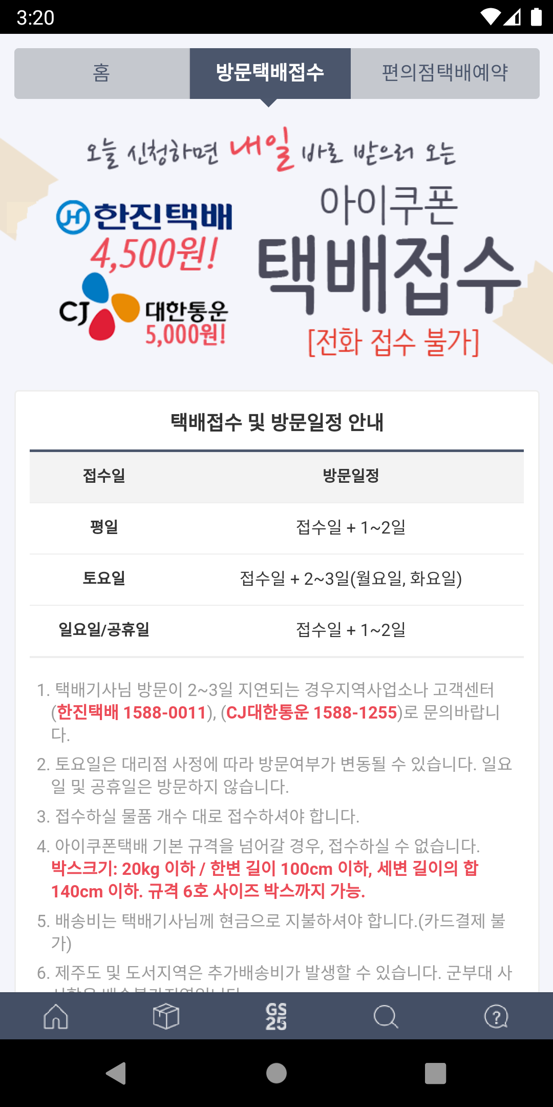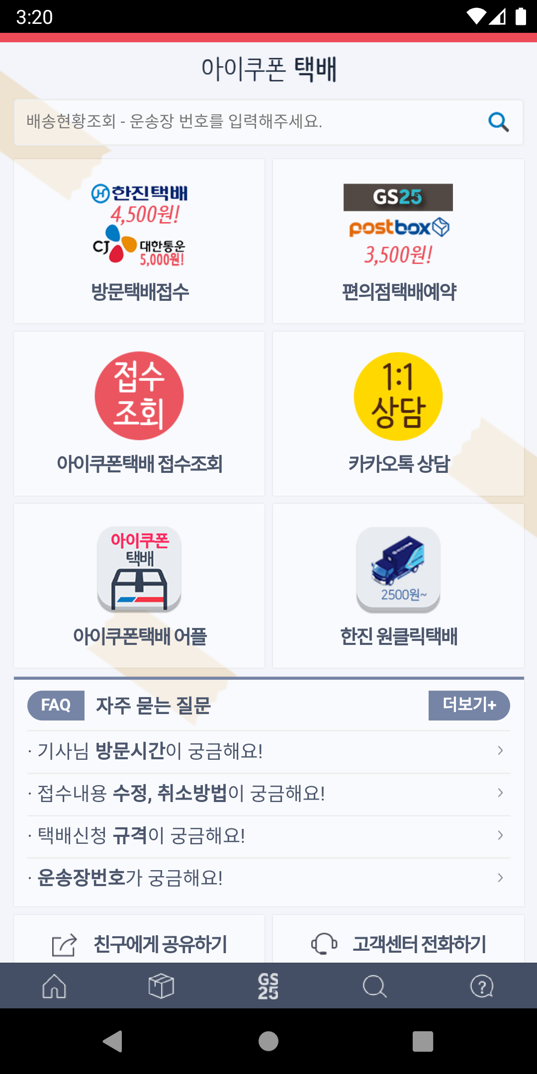 If you encounter any issues, feel free to reach out to customer service for assistance.Introducing "아이쿠폰 택배," the ultimate parcel booking solution in Korea. With a seamless interface, users can easily schedule home pickups with top courier services or opt for the convenience of dropping off parcels at nearby GS25 stores. Say goodbye to heavy lifting and endless price comparisons - this app streamlines the entire process. Backed by industry leaders like Hanjin and CJ Logistics, "아이쿠폰 택배" focuses on simplicity and efficiency. Whether you're sending a package or booking a convenience store courier, this app has you covered. Download 아이쿠폰 택배 now for hassle-free parcel delivery!