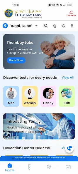 - The app provides a user-friendly interface for scheduling and managing lab appointments at Thumbay Labs locations with ease.
