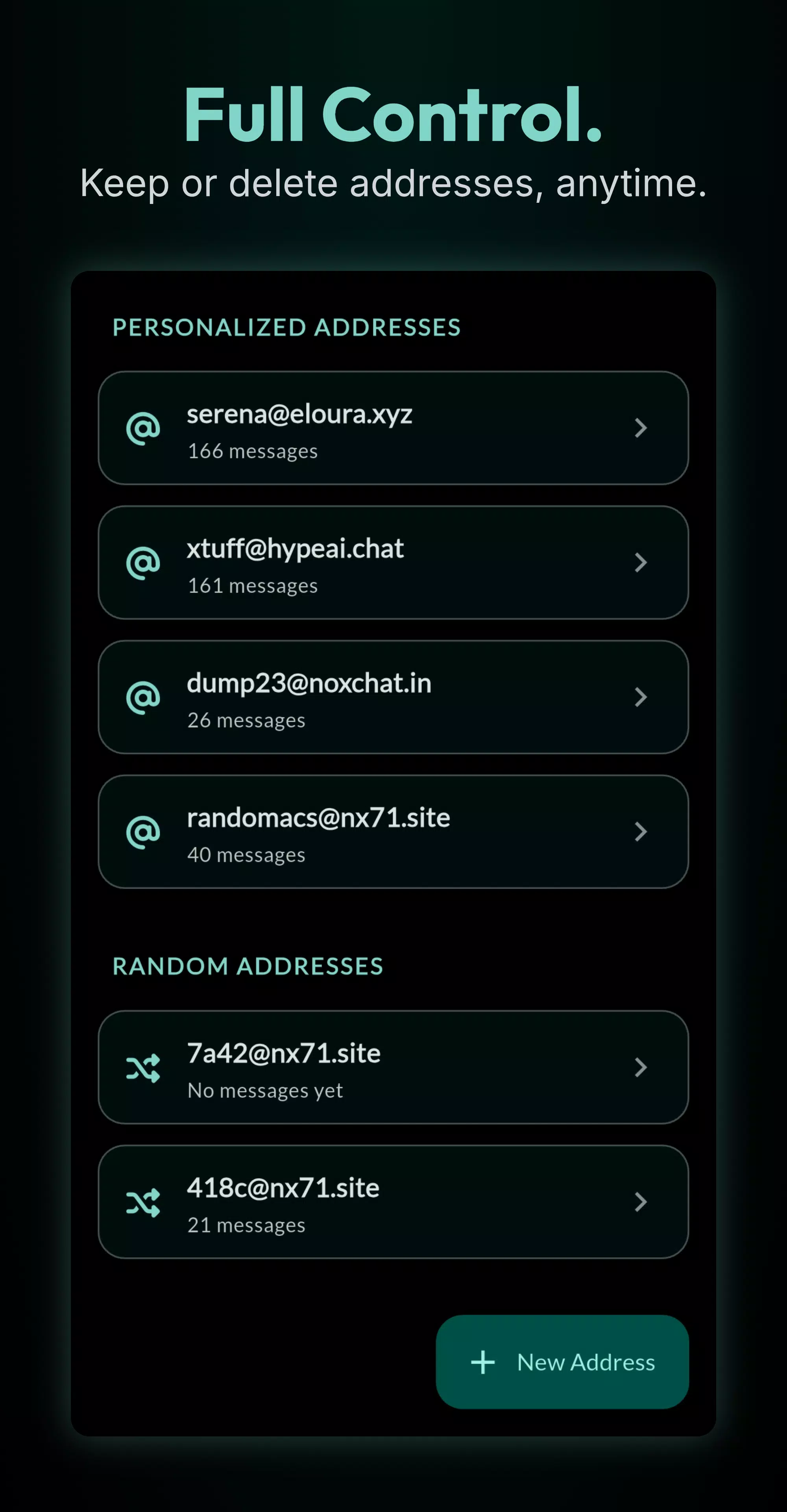Generate up to 50 random email addresses for free users, up to 200 total addresses for premium users.