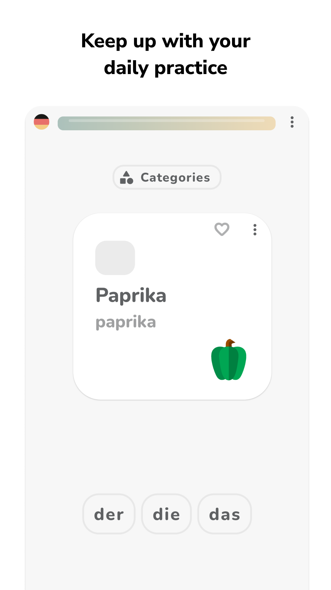 Der Die Das - German Articles master German articles without the hassle of boring flashcards and confusing rules? Look no further than this innovative language learning app! Combining smart repetition techniques and interactive speech exercises, this app revolutionizes the way you learn "der, die, das" alongside nouns. With daily rapid repetition sessions, practical examples of article rules, and offline functionality to practice your favorites anywhere, this app makes mastering German gender a breeze. Say goodbye to frustration and hello to confidence in speaking German! Download now and start your journey to fluency. Happy learning!