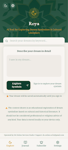 Roya - Dreams Interpreter helps you record and explore dream meanings with a searchable symbolism library, a private journal, and simple tools to track recurring themes. Roya - Dreams Interpreter keeps entries organized with tags, dates, and optional notes to support personal reflection. Roya - Dreams Interpreter presents common interpretations as guidance, not diagnosis.