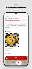 Manage orders, view past purchases, and apply offers at checkout. The rewards section shows your points balance and available redemptions, making it simple to redeem rewards when you order.