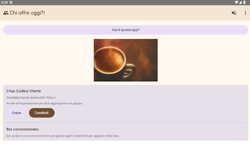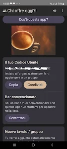 In Chi paga il Caffè ? you can create a group table and add participants quickly or invite them by User Code so a member appears directly in their app. The one-tap decision uses past turns to select the next person, helping to balance contributions over time. A detailed shift history records date, time and who paid to prevent disputes and track contributions. You can set the coffee location such as a bar name or machine spot so everyone knows where to collect coffee. Guest mode lets you try the app without signing in for temporary use, and optional Google sign-in links your profile to allow recovery of groups if you change or lose your device.