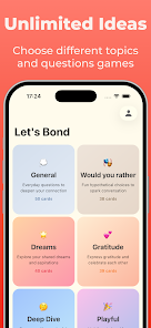Couple Questions Game: Bond offers over 350 questions across six themed decks: General (free), Would You Rather (premium), Dreams (premium), Gratitude (premium), Deep Dive (premium), and Playful (premium). The interface is clean and intuitive to support easy turn-taking and a natural flow of conversation. The app works fully offline and does not show ads, and regular content updates add fresh questions and prompts over time.