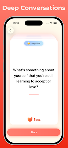 Most themed decks are offered as premium content, so only the General deck is available without purchase. Some Deep Dive questions are intentionally personal and may feel intense for newly formed relationships; users can choose lighter decks when appropriate.