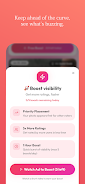 Optional visibility boosts (rewarded ad) temporarily prioritize posts in discovery feeds for one hour.