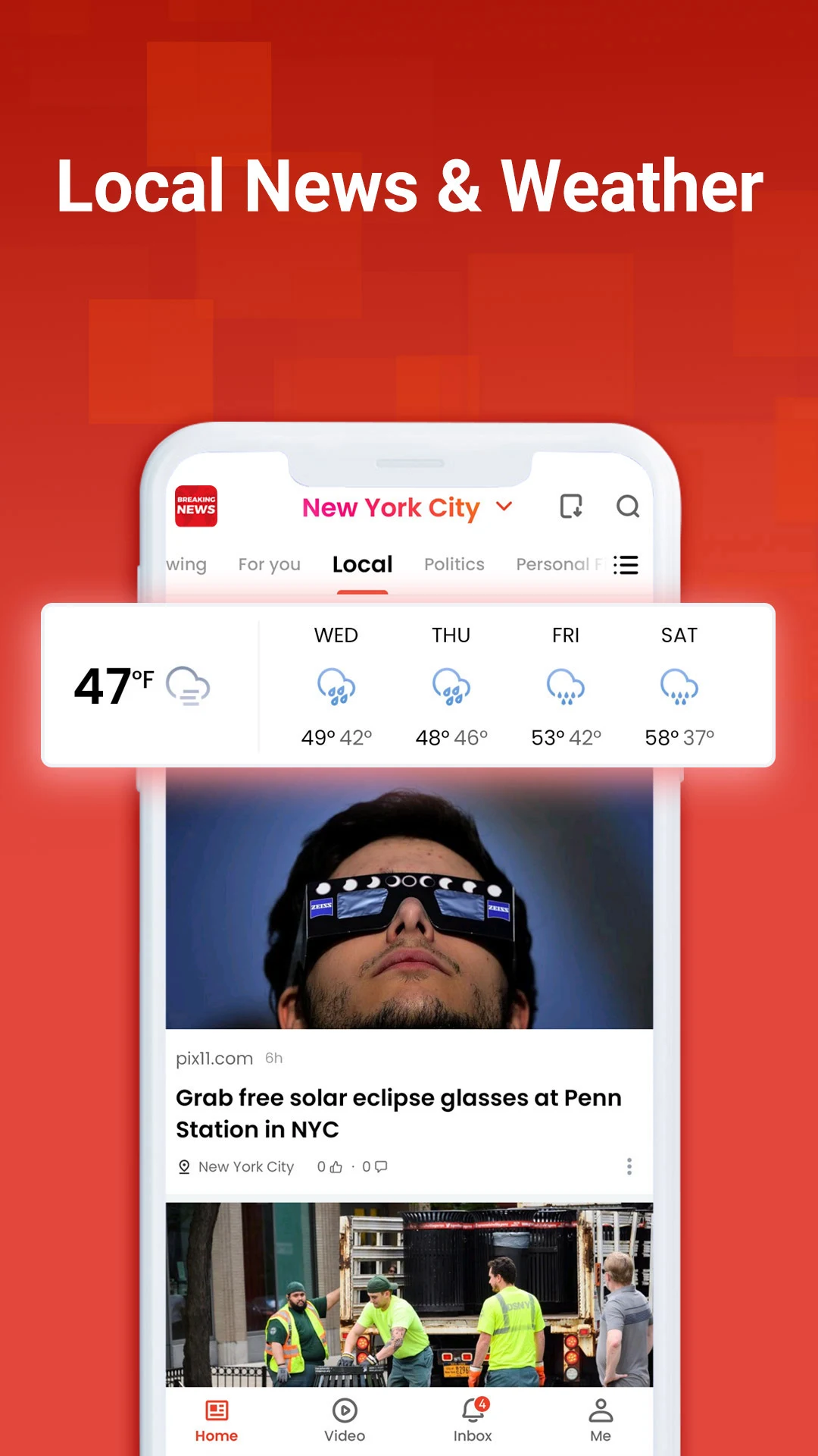 Regional weather notices and local community reporting integrated into your feed.