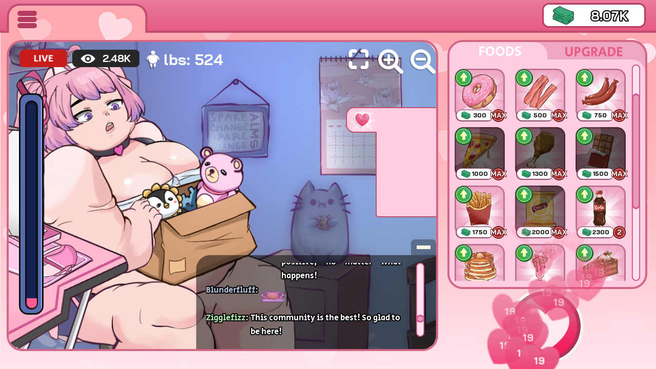 The core mechanic revolves around feeding the streamer—each snack or meal changes their physique in real-time, offering visual feedback and unlocking new reactions, outfits, and milestones.