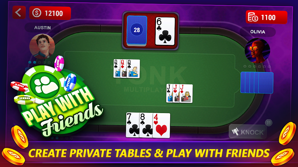 Tonk is a fast, strategic card game app that brings the classic tonk rules to mobile play, ideal for anyone who wants quick rounds that reward memory, timing, and tactical aggression. Players try to empty their hand by forming ‘‘spreads’’—either three or four of a kind or runs of three or more cards in the same suit—and can add to their own or an opponent’s spreads as the round unfolds. With simple mechanics, short rounds, and 2–3 player matches, Tonk is great for casual sessions with friends or for competitive play against other people online.