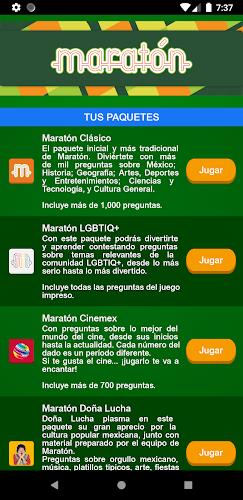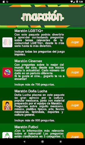 Maratón ships with the Maratón Clásico pack of over a thousand questions and offers themed packs such as Maratón Futbol, Maratón Cinemex, Maratón Doña Lucha contra la Ignorancia and Maratón LGBITQ+. Multiplayer matches can be private—invite friends through Facebook, recent opponents, or share an invite code via messaging apps—or you can join open games to face random opponents. The simple energy and streak mechanics keep matches brisk while rewarding hot streaks and comeback attempts.