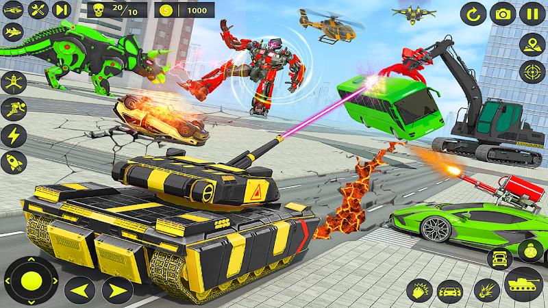 Army Tank Robot Car Games is a fast-paced transforming-robot action game that puts players in control of tanks, cars, helicopters and jet robots across city rescue and aerial combat missions, letting machines switch between ground and air roles to meet varied objectives.