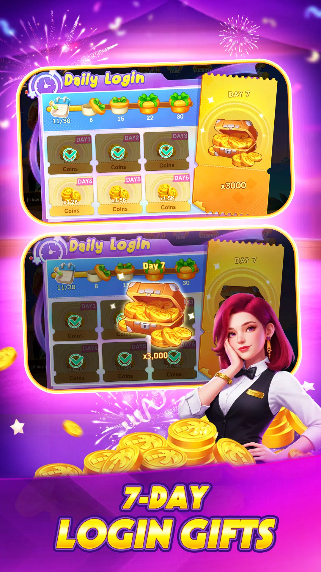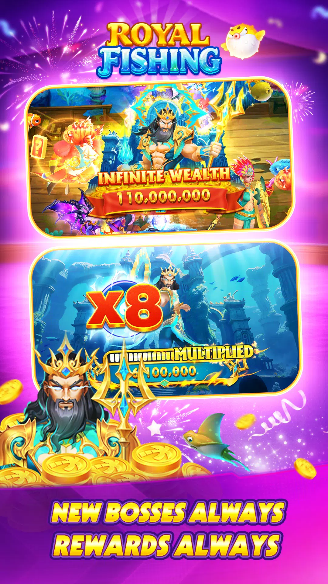 Royal Empire offers ocean slots such as Dolphin Reef, Great Blue and FaFaFa with Wilds, bonus symbols and expanding wild mechanics. The arcade fishing modes include Royal Fishing with boss battles and quests and West Journey Fishing with four-player real-time rooms. Fast Big2 PvP matches and time-limited contests provide quick head-to-head card play. The interface emphasizes a neon-style UI with smooth transitions and responsive taps, and daily freebies like a welcome bonus, seven-day login rewards, daily spins and online-time prizes are easy to claim.