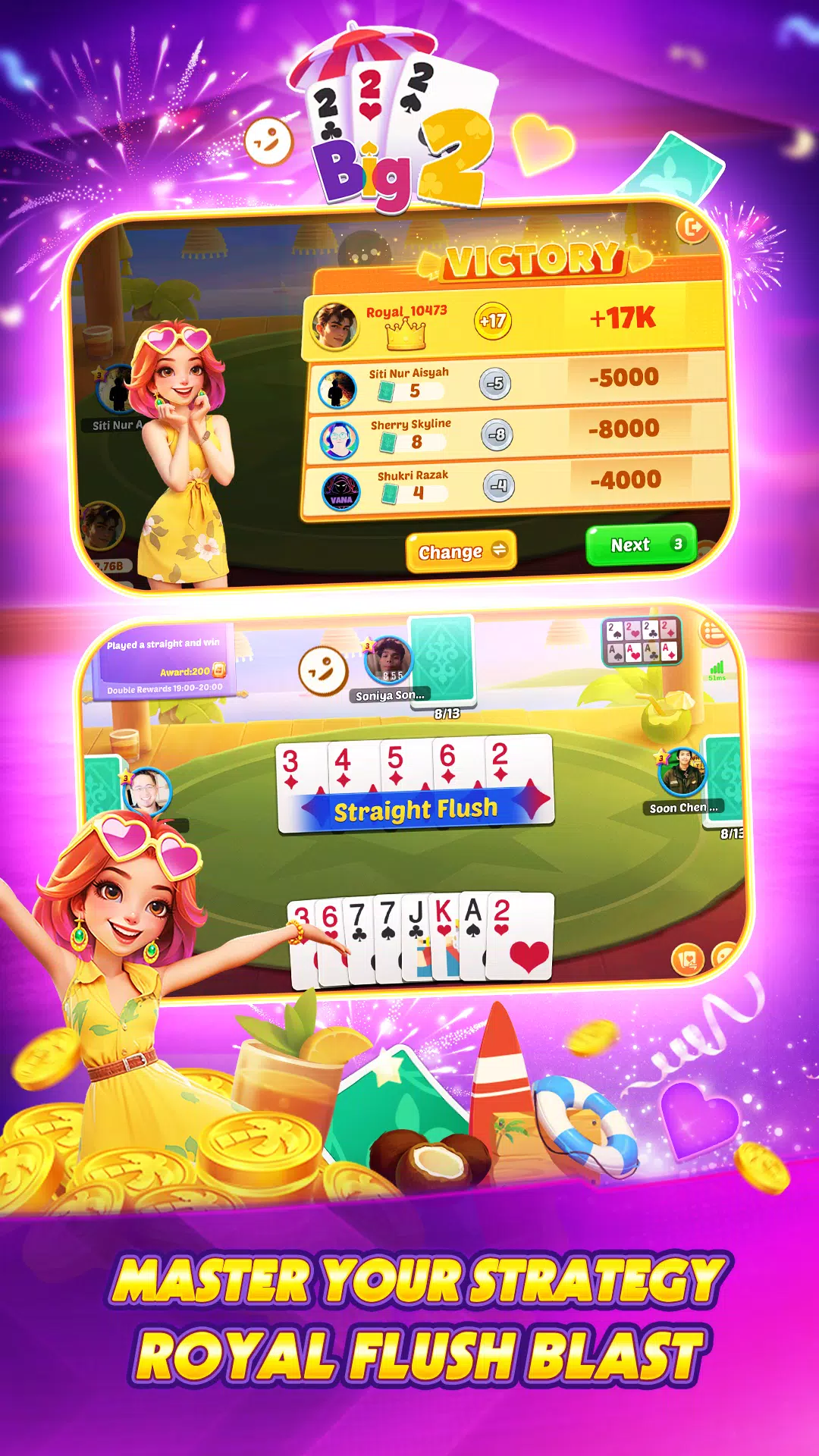 Royal Empire brings neon-styled ocean slots, arcade fishing and quick PvP card matches into a single casual package designed for short, relaxing play sessions. Players can spin themed slot reels, hunt bosses in fishing modes, join four-player rooms or jump into fast Big2 card battles while enjoying bright neon visuals and responsive controls. Because all coins are virtual, Royal Empire is aimed at players seeking low-pressure entertainment rather than real-money gambling.