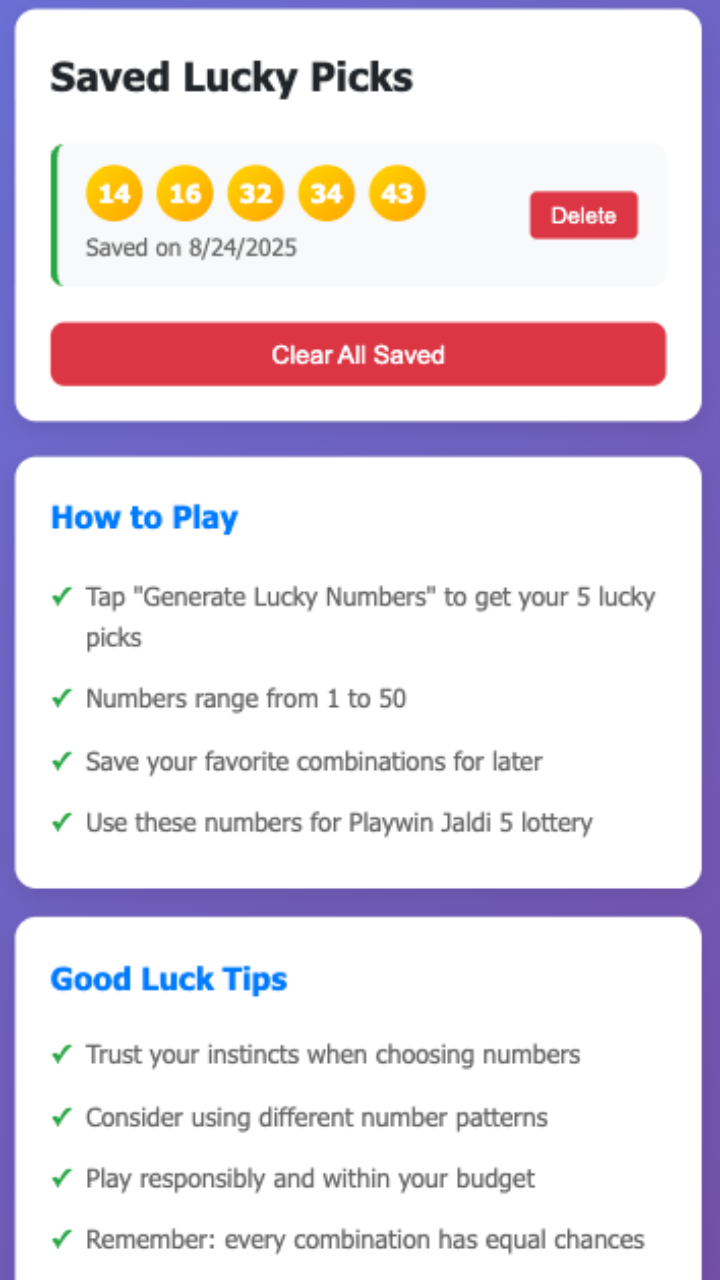 Playwin Jaldi 5 – Lucky Pick is a compact companion for lottery players who enjoy Playwin games and want quick, intelligent number suggestions. The app generates a set of five probable winning numbers for popular formats such as Jaldi 5, lotto and Double Lotto, giving players instant combinations with a single tap and speeding up ticket selection. Designed for both newcomers and experienced players, Playwin streamlines number-picking and adds an engaging element to your routine by removing guesswork and making gameplay more efficient and enjoyable.
